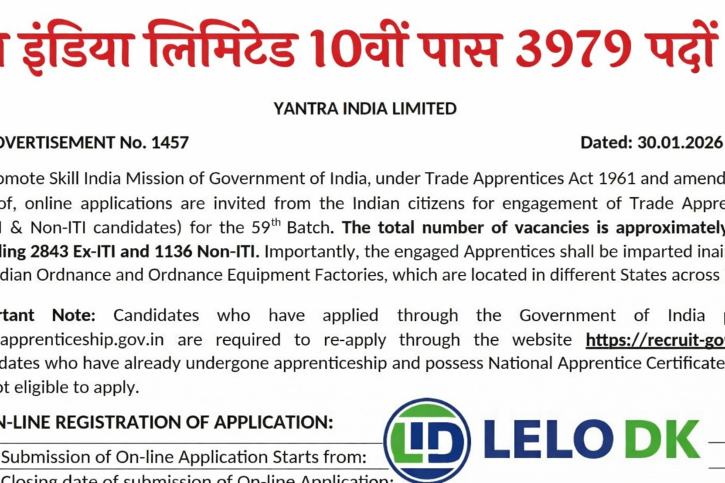 यंत्र इंडिया लिमिटेड ने 59वें बैच के ट्रेड अप्रेंटिस पदों पर भर्ती के लिए Official Notification जारी कर दी है। इस भर्ती अभियान के तहत कुल 3979 पदों पर नियुक्ति की जाएगी। इन पदों के लिए योग्य Male and Female Candidates से Online माध्यम से Applications Invited किए गए हैं।